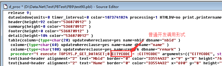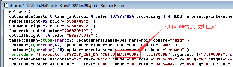 当 Datawindow 以 Stored Procedure 作为数据源时,PB10 以上同普通开发,但是 PB9 需要对 DataWindow Edit Source 然后将存储过程的参数加上@,如下图比对: