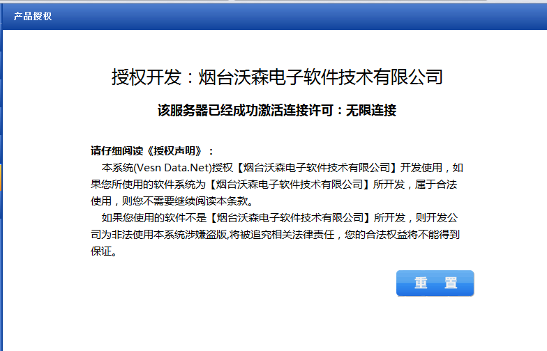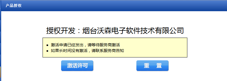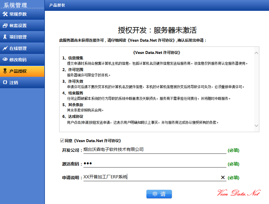 登录【系统管理】,进入【产品授权】页面,输入开发公司名称(贵公司名称)、激活密码及申请说明,发送激活申请: