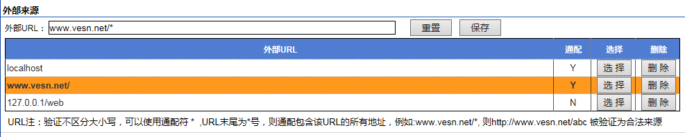 支持末尾通配符*,例如:www.vesn.net/*,则http://www.vesn.net/a 或 http://www.vesn.net/b 都为合法访问来源